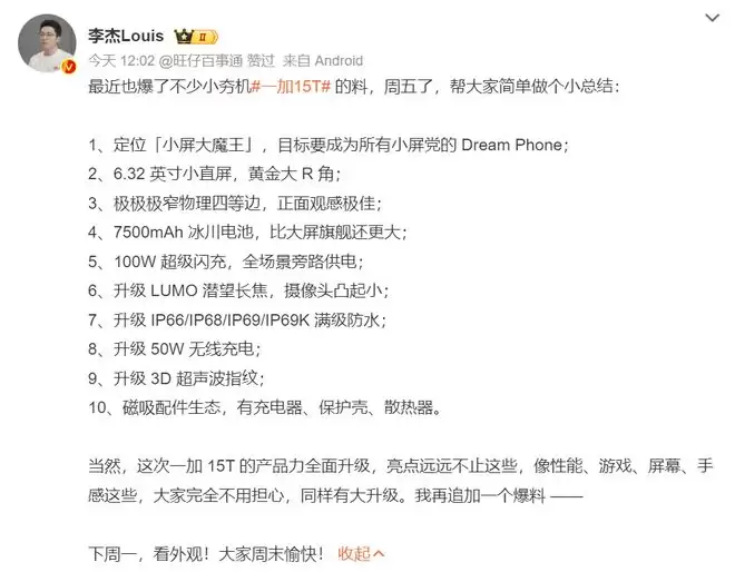 总之,一加15T的发布会就在3月中下旬,下周一外观正式揭晓,如果是小屏党的话,那么这次可以认真考虑了。