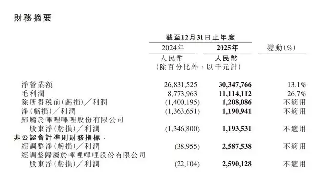 3月5日,哔哩哔哩(Nasdaq:BILI,09626.HK,以下简称“B站”)公布了截至2025年12月31日止第四季度及全年财报。数据显示,2025年B站总营收为303.5亿元,同比增长13.1%;净利润为11.9亿元,上年同期净亏损13.6亿元;经调整净利润为25.9亿元,实现全年盈利,上年同期经调整净亏损3900万元。