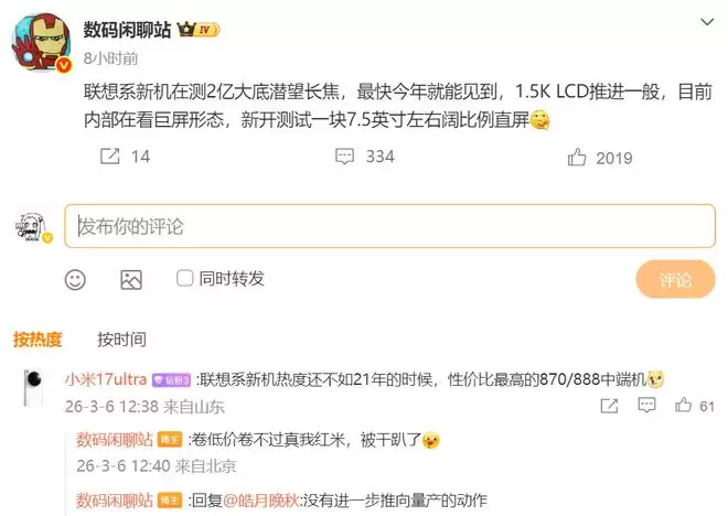 近期有博主爆料了联想新机的消息,但有网友进行了锐评,称联想系新机热度还不如21年的时候,性价比最高的870/888中端机。