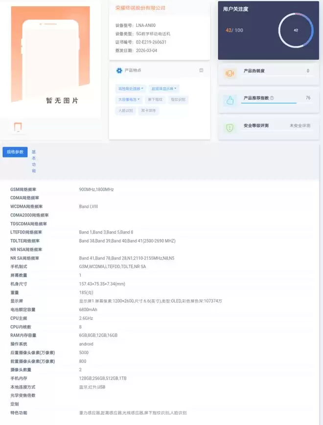 原因是型号LNA-AN00的国行5G新机和型号NLA-AL00的国行4G新机同日亮相,分别指向荣耀X80i和荣耀Play 11T。