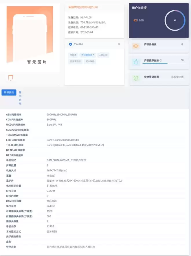 另一款型号NLA-AL00的国行4G新机大概率是荣耀Play 11T,配置单走的是另一个极端:采用的是6.75英寸720P LCD屏幕,5130mAh电池,仅186克,厚度7.89mm。