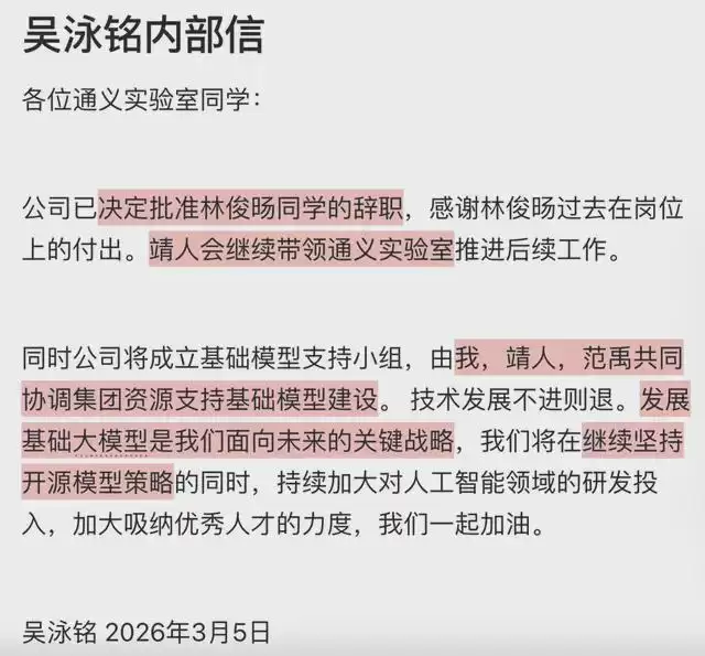 全员会第二天,3 月 5 日上午。吴泳铭给 Qwen 全员发送邮件,称已接受林俊旸离职。邮件还提及,阿里会继续坚持开源模型策略;周靖人会继续带领通义实验室;吴泳铭、周靖人和阿里集团 CTO 吴泽明(范禹)会共同协调集团资源,支持基础模型建设。