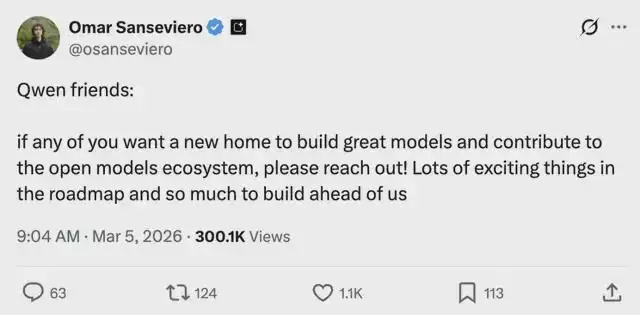 林俊旸的离职引起一连串外部反应。Google DeepMind 的开发者体验负责人在社交媒体上邀请 Qwen 成员加入:“如果你想找到构建好模型和贡献开源社区的新家”。