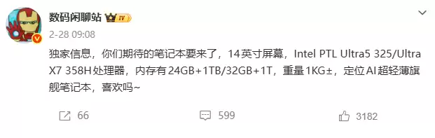 据此前“数码闲聊站”等博主的爆料,此次新品定位为14英寸AI超轻薄旗舰,整机重量仅约1公斤,足以满足移动办公与外出携带的需求。其搭载英特尔Panther Lake架构的Ultra 5 325或Ultra X7 358H处理器,并提供24GB+1TB、32GB+1TB两种大容量存储组合,旨在兼顾多任务处理与大文件存储的使用场景。虽然具体的续航参数尚未公布,但结合小米此前在笔记本产品上的技术积累,以及“续航与性能兼备”的产品定位,新机有望在功耗与电池续航方面进行显著优化,彻底解决用户对于便携本续航能力的顾虑。