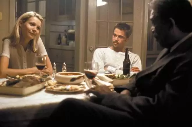 《七宗罪》无情地让我们感受它的恐怖,有些恐怖的感觉利用简单的镜头来匆匆捕捉会更有效。我们只有在警察讨论之后才能确定谋杀方法——虽然一个展示验尸后的塑料袋里的内容的镜头,也不再需要更多的解释了。
