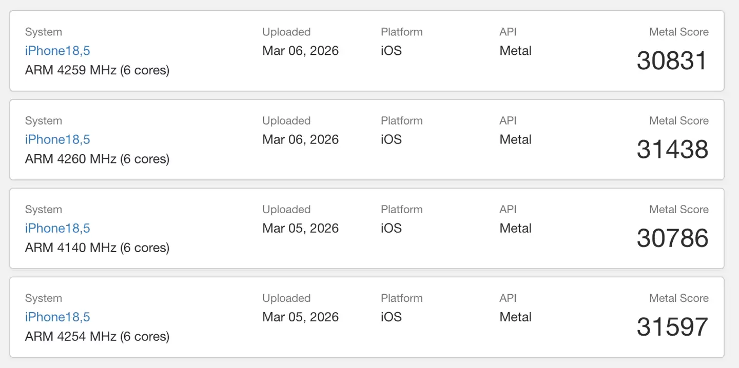 不过由于GPU核心数量的精简,iPhone 17e在Metal图形性能测试中的得分约为31000-31500分,明显低于标准版iPhone 17的37000分。