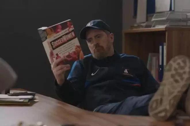 先导预告聚焦于一个极其关键的画面细节:镜头清晰地展示了Beard教练正在专心阅读由Gemma Clarke撰写的《足球女性》(SoccerWomen)一书。苹果巧妙地利用这一强关联性的道具元素,向观众提前透露了第四季剧情的重大发展方向。
