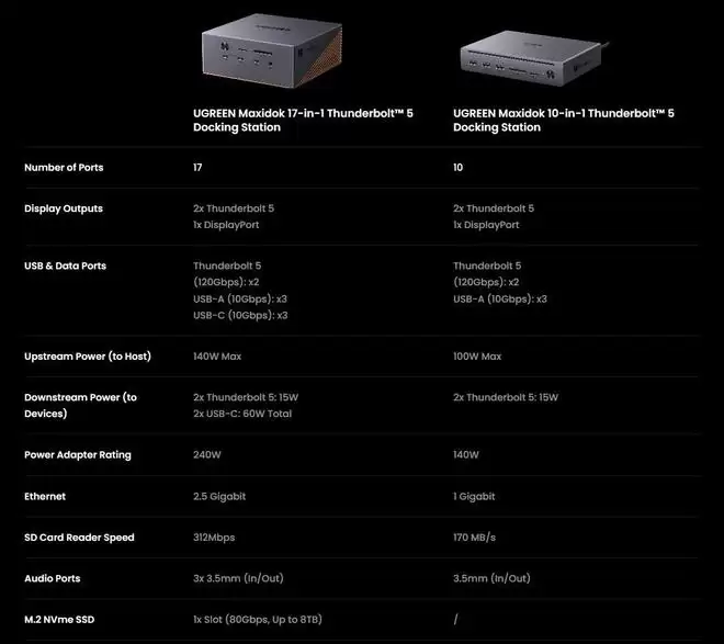 绿联Maxidok系列17合1雷电5扩展坞早鸟价389.99美元,10合1型号早鸟价则是249.99美元。