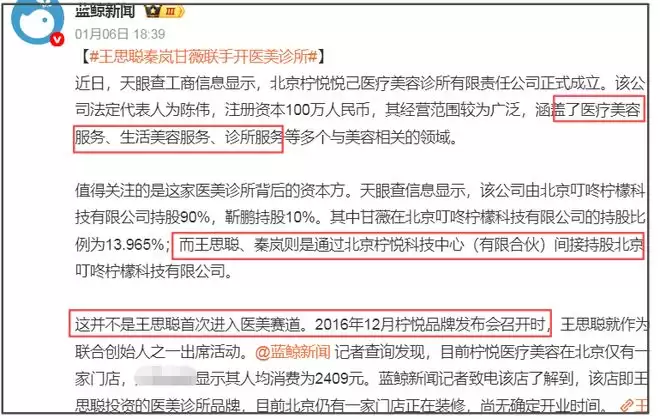 根据王思聪医美公司信息,网友查询到他与秦岚、甘薇在2025年12月成立了医美公司,注册资本100万,三人还是通过同一家公司间接持股,其中王思聪持股比例50,秦岚12.5。