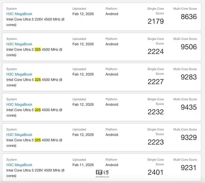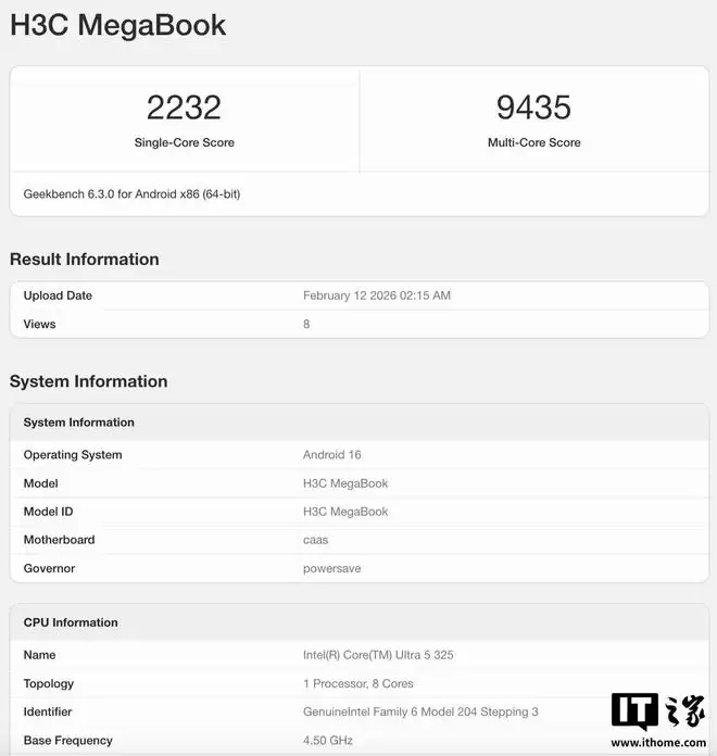 Geekbench数据显示,这款新华三MegaBook搭载了英特尔酷睿Ultra 5 325处理器,采用8核设计,最高频率可达4.5GHz,最高配备32GB内存。其单核成绩最高为2232分,多核成绩最高达到9435分。