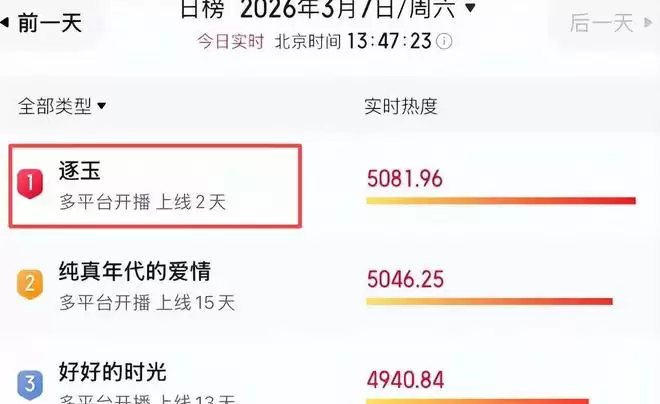 2026年3月7日,《逐玉》上线次日即引爆全网,稳居灯塔、猫眼、微博三大剧集热度榜首位,腾讯视频与爱奇艺双端数据同步飙升,一举跃升为三月最具统治力的现象级古装作品。