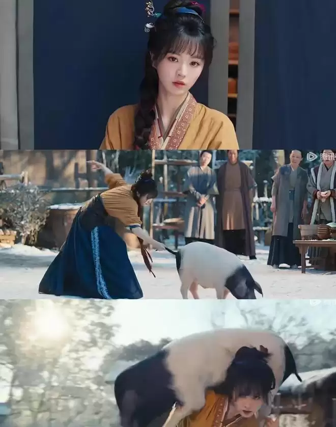 主角造型严格遵循人物逻辑:女主常年操持屠户营生,衣着是反复浆洗泛灰的粗麻短打,腰间别着沉实锋利的杀猪刀,袖口布满毛边与细微刮痕,即便立于猪圈泥泞之中、肉案油污之侧,也毫无违和,只觉鲜活可信。