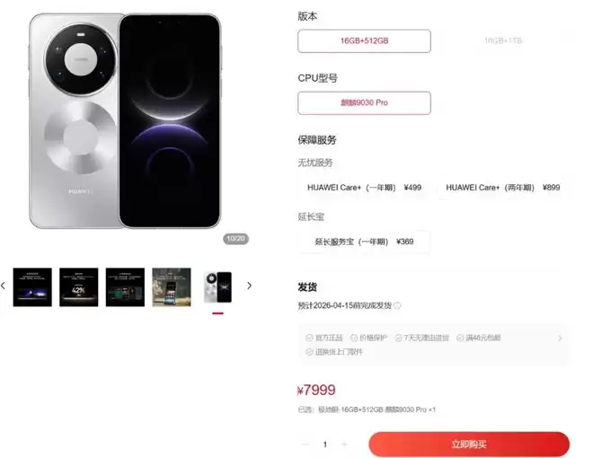 今天打开华为商城发现了一件久违的事,那就是进去Mate80 Pro Max的购买页面,绝大多数版本直接显示有货,下单后页面提示4月15日前发货。