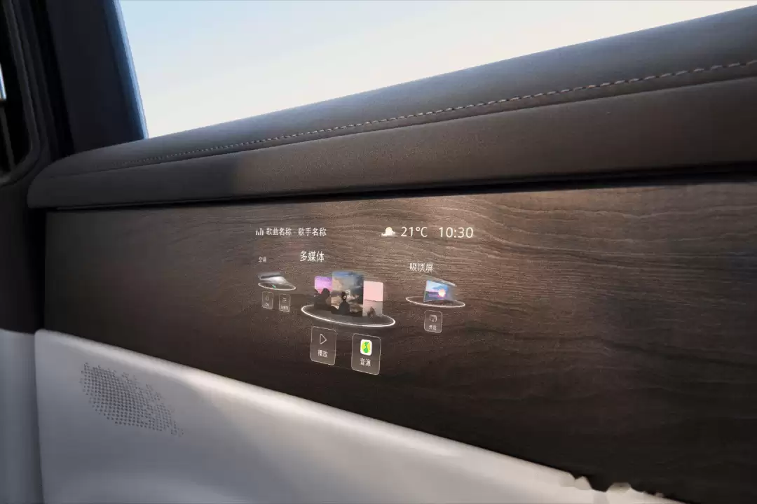 第二排门板的创新更富突破性。这块智能表面不仅支持触控操作,还能呈现立体视觉效果。乘客轻触门板即可调节温度、控制座椅,甚至操作隐藏式冰箱。当按下开门键时,屏幕会实时显示车外盲区影像,让安全功能与智能交互完美结合。这种“无形胜有形”的设计哲学,使内饰彻底摆脱了电子设备的堆砌感。