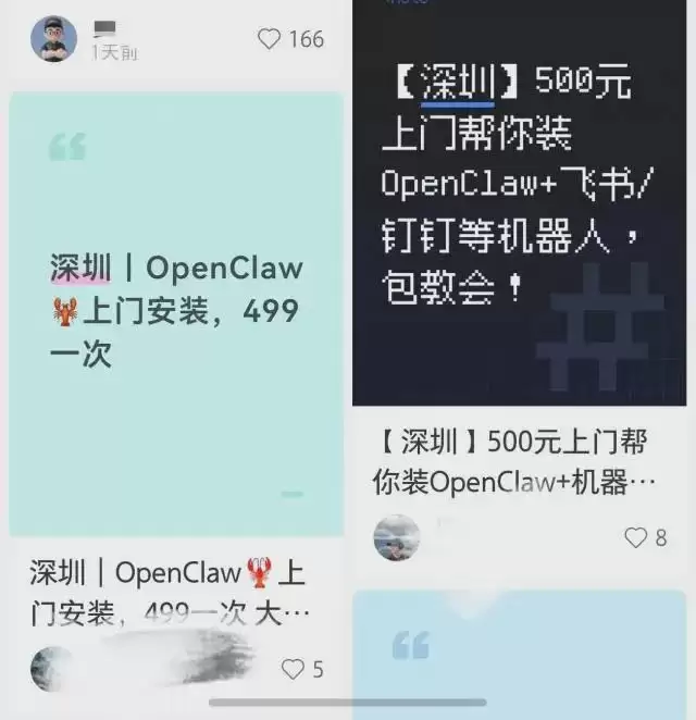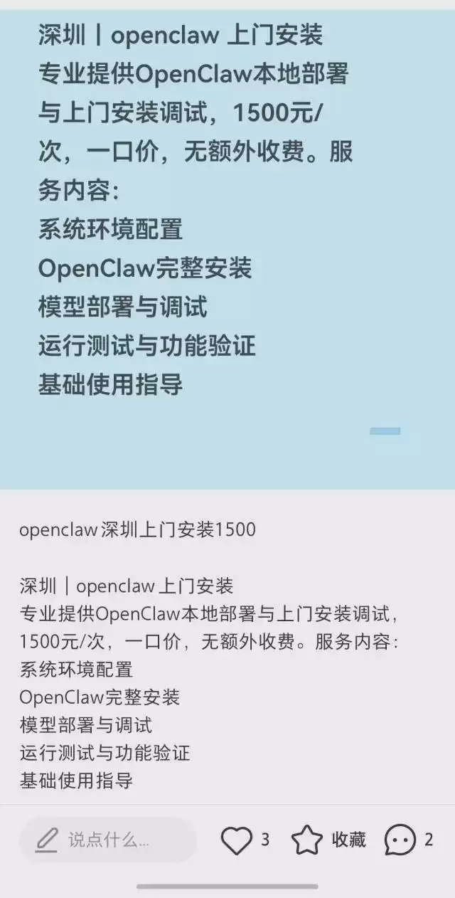 在国内社交平台上,“OpenClaw上门安装调试”的帖子随处可见。收费标准五花八门:远程安装300元起步,上门服务则从500元到1500元不等,服务内容涵盖本地部署、调试运行和基础使用指导。