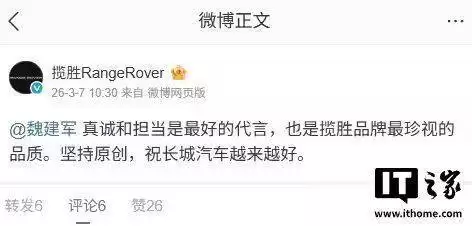 3月7日,路虎旗下揽胜品牌通过最新微博发布声明,以“真诚和担当是最好的代言”肯定长城汽车的处理态度,同时重申“坚持原创”的品牌理念,并祝愿中国汽车工业持续进步。这条回应被网友评价为“大气且有格局”,相关话题迅速登上热搜榜。