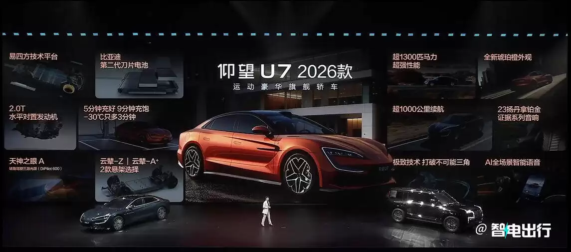 作为性能旗舰,26款仰望U7新增纯电超级四电版,售价定为88.8万元,且无需缴纳豪车税。该版本搭载640kW单枪快充技术,纯电续航突破1000公里,并首次下放仰望U9的分段磁钢电机技术。U7全系配置上涨3万元,入门版价格升至65.8万元。技术参数显示,其充电效率与续航能力已跻身行业第一梯队。