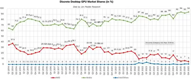 从市场份额来看,英伟达在2025年全年占据主导地位,第一季度市场份额为92%,到第四季度进一步上升至94%。相比之下,AMD第一季度尚占有8%的份额,然而到了第四季度则下滑至5%,这是AMD及ATI品牌有史以来的最低水平,原因可能与RX 9000系列显卡早期供应不足有关。