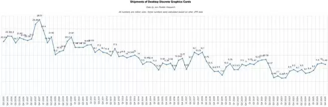 近日据IT之家消息,市场调研机构Jon Peddie Research发布数据显示,2025年台式机独立显卡出货量已达4428万张,攀升至近十年来的第二高位,相较去年增长近千万张。然而去年售出的显卡中,绝大多数来自英伟达GeForce系列,AMD Radeon显卡的销量则跌至历史低谷。