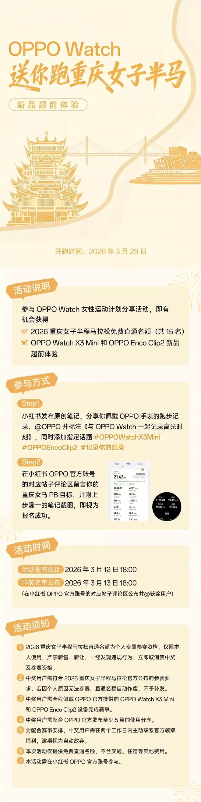 参与活动即有机会赢取重庆女子半程马拉松免费直通名额,还有 OPPO Watch X3 Mini、OPPO Enco Clip2 新品的抢先体验权!