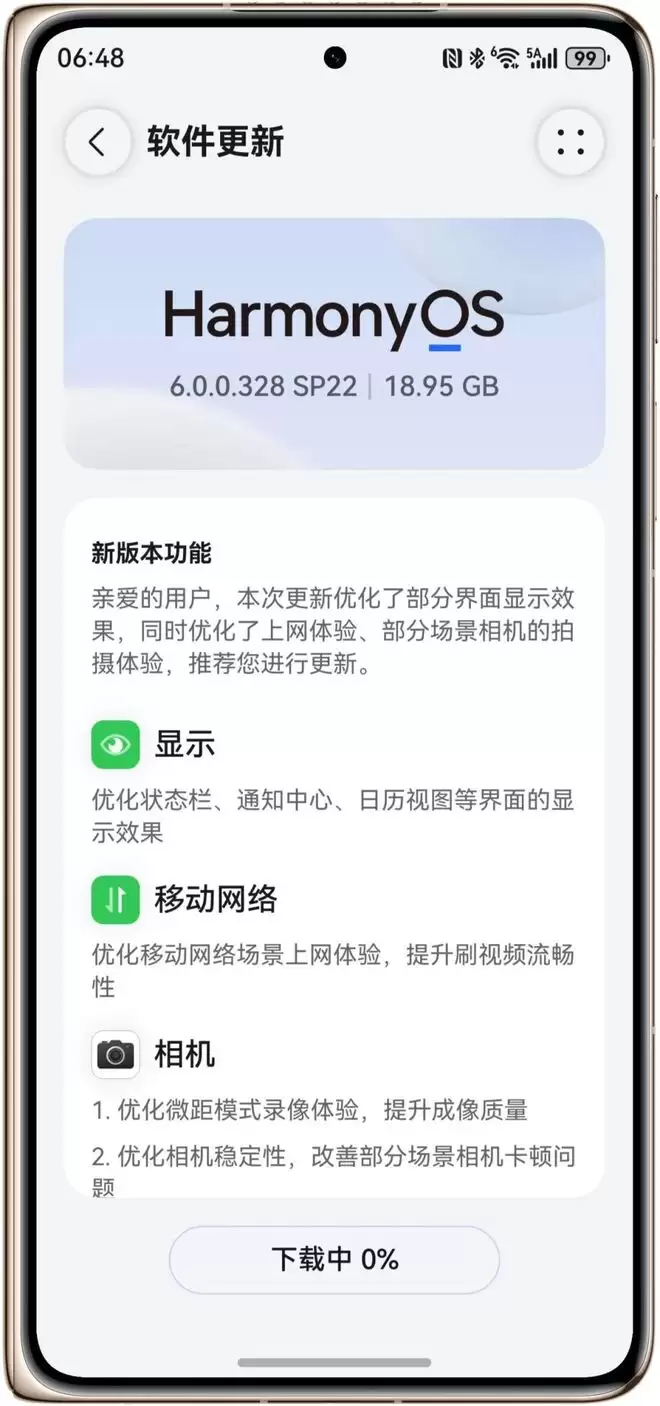 优化移动网络场景上网体验,提升刷视频流畅性;优化微距模式录像体验,提升成像质量;优化相机稳定性,改善部分场景相机卡顿问题。