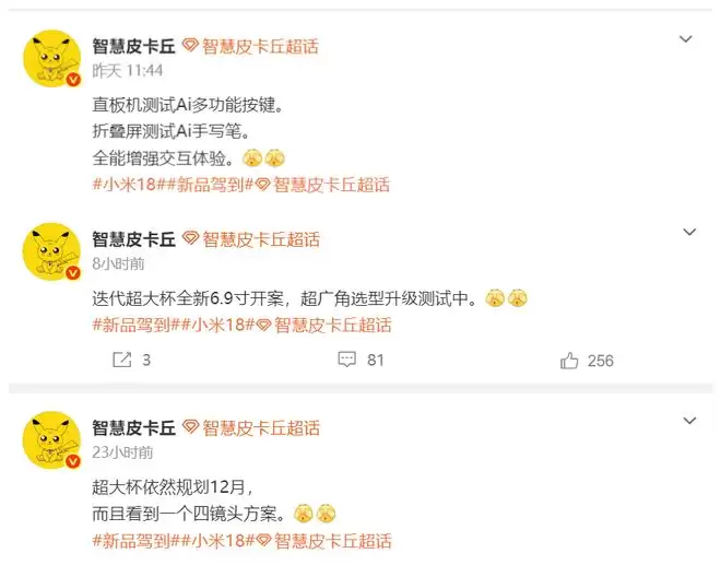 因为近期有博主透露,小米超大杯依然规划12月登场,而且小米18 Pro Max全新6.9寸开案,超广角选型正在升级测试中。