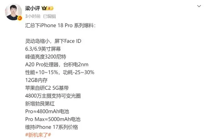 原因也非常的简单,那就是近期有博主汇总了一波iPhone18 Pro系列的爆料信息,加上之前各路分析师和供应链的消息。