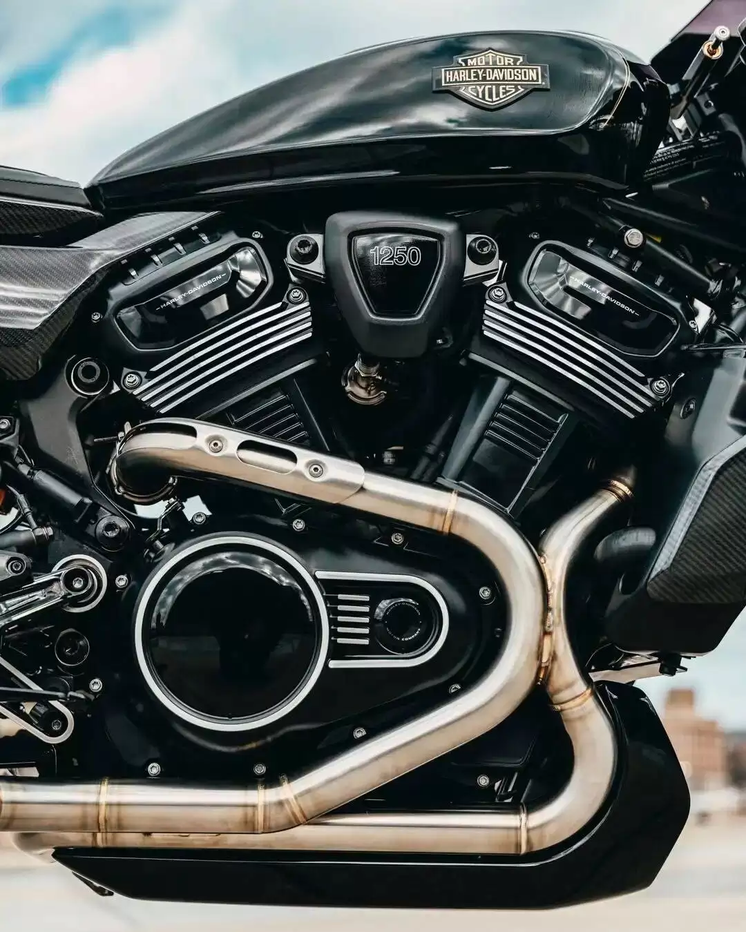 在材质运用上,RMCR 概念车可谓独具匠心。这台车几乎被碳纤维全面覆盖,经典的子弹头整流罩、油箱顶部、单座车尾、前土除,以及水箱护罩侧边与座垫下方等部位,均采用碳纤维材质打造。这种材料的运用不仅营造出极致的轻量化视觉效果,还赋予了车辆一种奢华的质感,彰显出哈雷在工艺和设计上的高超水准。