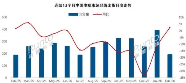 【CNMO科技消息】3月9日,根据洛图科技(RUNTO)最新发布的《中国电视市场品牌出货月度快报》数据,2026年2月,中国电视市场品牌整机出货量达到189 5万台,较去年同期小幅增长2 4%,是经