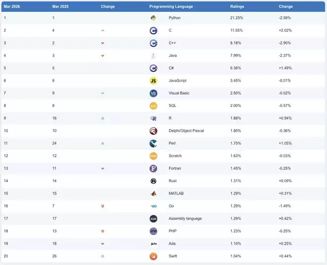 据IT之家3月9日报道,TIOBE编程社区指数作为衡量编程语言受欢迎程度的重要指标,其评估数据来源于全球范围内的工程师、课程、供应商及搜索引擎。近日,TIOBE正式公布了2026年3月的编程语言排行榜,以下是IT之家整理的榜单详情: