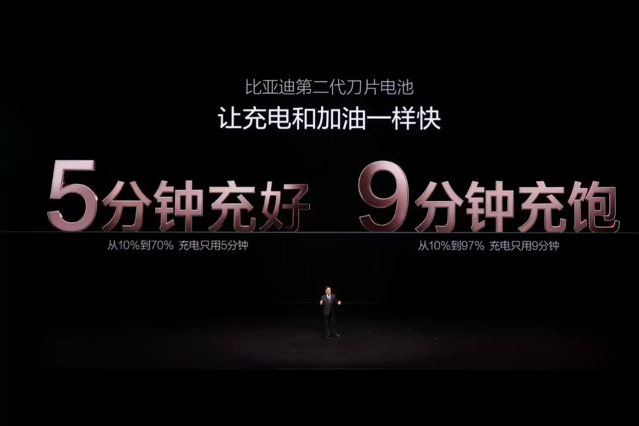 在3月5日的比亚迪“闪充中国 改变世界”发布会上,比亚迪集团董事长兼总裁王传福发布了比亚迪迪二代刀片电池及闪充技术,并宣布了一个极具颠覆性的充电速度: