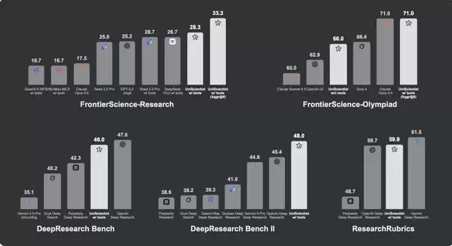 FrontierScience-Olympiad上,启用工具的 UniScientist 得分71.0,匹配 Claude Opus 4.5,超越多个其他前沿模型。在多项分布外的基准 ——DeepResearch Bench、DeepResearch Bench II 和 ResearchRubrics上 —— 模型的表现与一系列顶级闭源系统相当。