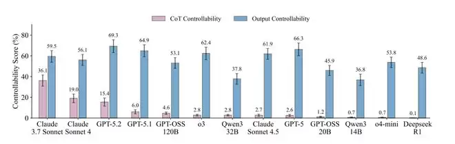 色为CoT可控性,粉色为输出可控性,两者落差在所有模型中普遍存在