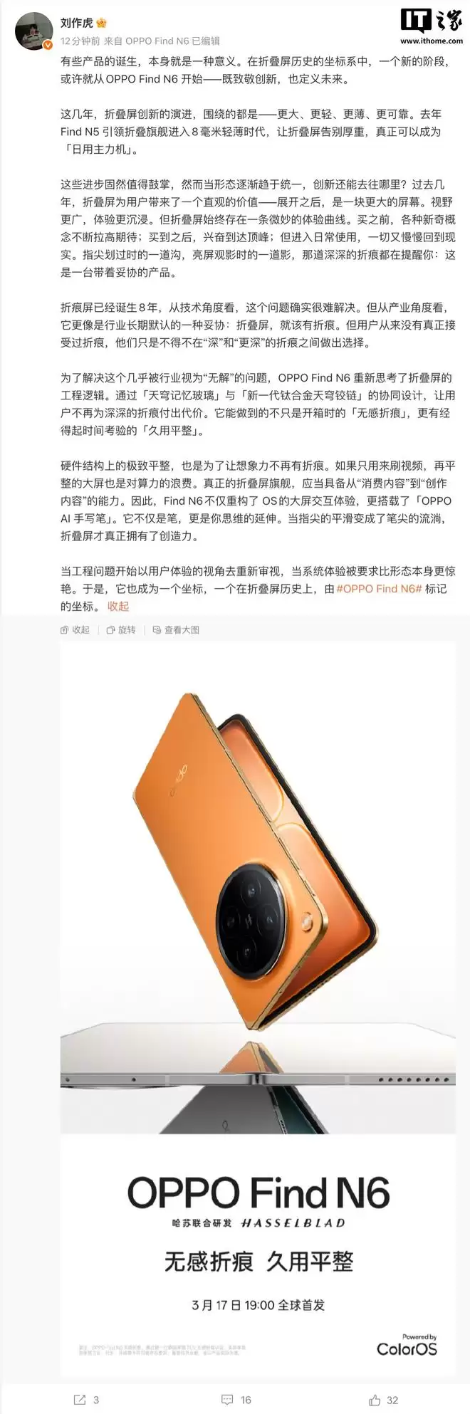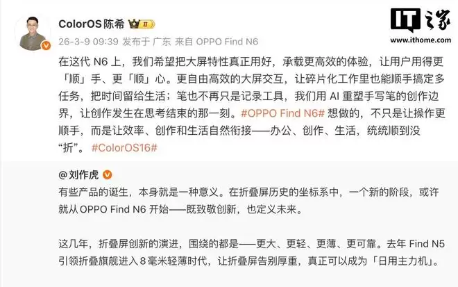 IT之家 3 月 9 日消息,今天上午,OPPO 首席产品官、一加创始人 @刘作虎 在微博发文详解 OPPO Find N6 折叠屏手机的设计思路。他直言:在折叠屏历史的坐标系中,一个新的阶段,或许