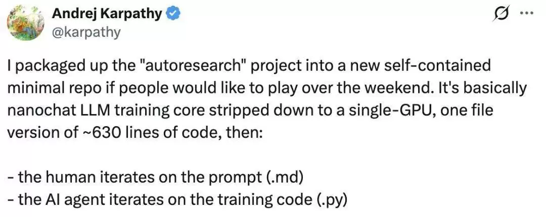 Karpathy表示,这个项目所讲述的,正是人工智能自我迭代的未来,以及它是如何开始的。