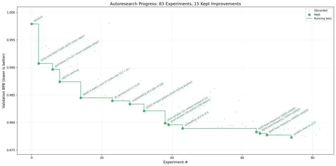Agent会修改代码,训练模型5分钟,检查结果是否有所提升;如果性能更好就保留修改,否则就丢弃,然后继续重复这一过程。等到第二天早上醒来时,你会看到一整份实验记录,以及——在理想情况下——一个性能更好的模型。