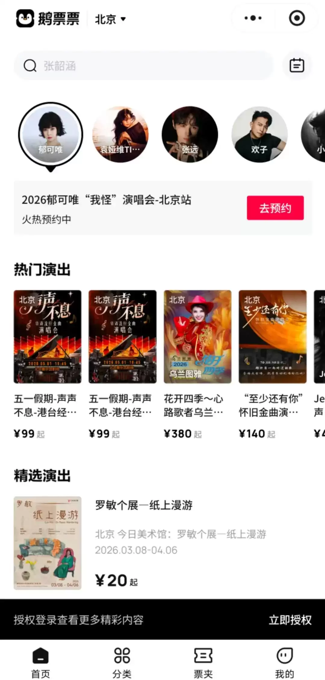 从平台页面可以看到,鹅票票在北京地区上架了丰富的演出内容,涵盖华语流行演唱会、经典金曲音乐会、艺术展览等多种类型。