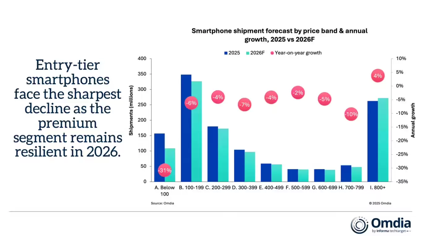 Omdia指出,本轮存储器行业的“超级周期”将深刻影响到占据全球出货主力的100至399美元(约合691至2759元人民币)核心价位段产品。而定价低于100美元的超低端细分市场更将出现31%的显著下滑。不过,单价在800美元(约合5531元人民币)以上的高端市场则有望逆势实现4%的出货量增长。