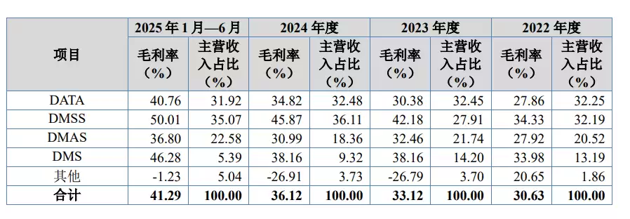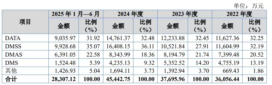 公司主营业务收入主要来源于DATA、DMSS、DMAS和DMS四类产品,其中DATA产品和DMSS产品的销售收入占比较高。在2024年度、2025年1-6月期间,上述四类产品的合计销售收入占主营业务收入的比例分别为98.14%、96.30%、96.27%及94.96%。