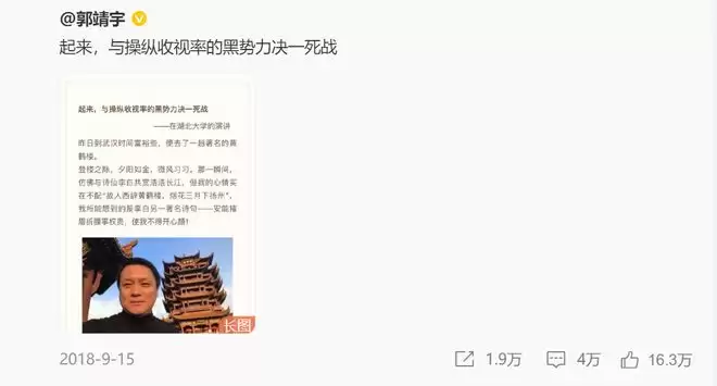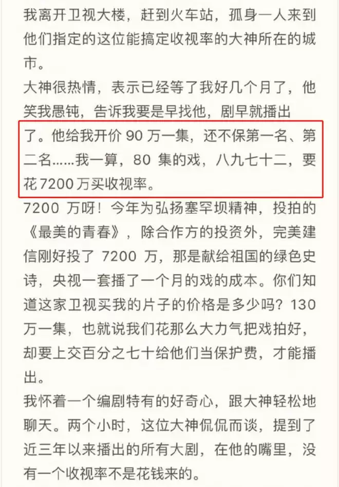 当时收视率还是衡量一部剧成功与否的重要指标,导演郭靖宇一怒之下撕开行业黑幕,用“起来,与操纵收视率的黑势力决一死战”为题,透露自己的剧《娘道》迟迟不能播出,电视台回复说要“操作”收视率,接着他辗转找到一位能搞定收视率的“大神”,对方开价90万一集,还不保第一名,80集就要7200万,刚好是《最美的青春》的投资成本。这位大神还明确告知“近三年以来播出的所有大剧,没有一个收视率不是花钱来的。”