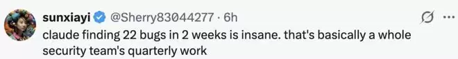 网友 sunxiayi 认为,Claude 能够在两周内发现如此多数量的漏洞真是「疯狂」,「这基本上相当于整个安全团队的季度工作。」