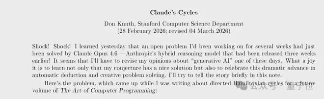 henry 发自 凹非寺量子位 | 公众号 QbitAI88岁的图灵奖得主、计算机科学奠基人Donald Knuth(高德纳)最近发文,惊呼Shock! Shock!。在他的短文《Claude’s