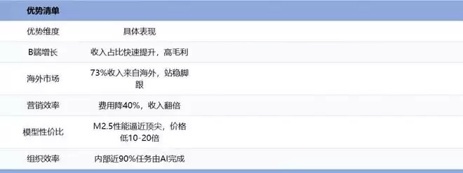 它手里有筹码:B端收入加速增长,海外市场已经站稳脚跟,经常性收入占比跃升,营销效率持续改善;M2.5的性能和成本形成的剪刀差,内部近90%任务由AI完成的组织效率,都证明它在技术和商业化上已取得阶段性成果。