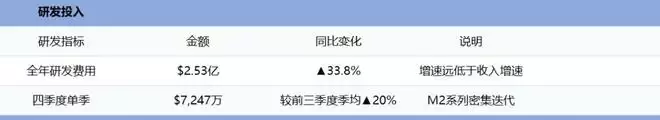 研发投入的节奏,也印证了战略重心在转移。2025年公司研发费用2.53亿美元,同比增长33.8%,增速远低于收入增速;但四季度单季研发费用约7247万美元,比前三季度季均高出20%。