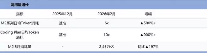 调用量的爆发,验证了性价比的吸引力。据媒体报道,2026年2月,M2系列文本模型日均Token消耗量比2025年12月增长超过6倍,编程套餐Coding Plan增幅超过10倍。