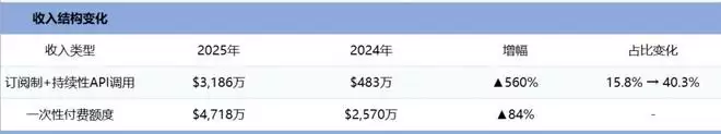 与订阅制和持续性API调用相关的收入,从483万美元增长到3186万美元,增幅达6.6倍,在总收入中的占比也从15.8%跃升至40.3%。