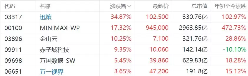 截至收盘,迅策股价大幅拉升近35%,Minimax上涨超过17%,金山云涨逾10%,赤子城科技涨幅也超过9%。