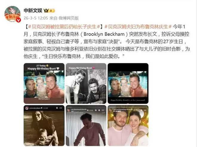 3月4日,贝克汉姆和维多利亚在社交媒体上同步发布了长子布鲁克林的童年旧照,配文“生日快乐,我们爱你”,试图为儿子送上27岁生日祝福。然而,这番温情一幕却因一个关键细节显得格外尴尬——他们根本无法@布鲁克林本人,因为这位寿星早已将全家人的社交账号统统拉黑。一场豪门家庭的“隔空喊话”,瞬间引爆了关于亲情边界与家族恩怨的舆论风暴。