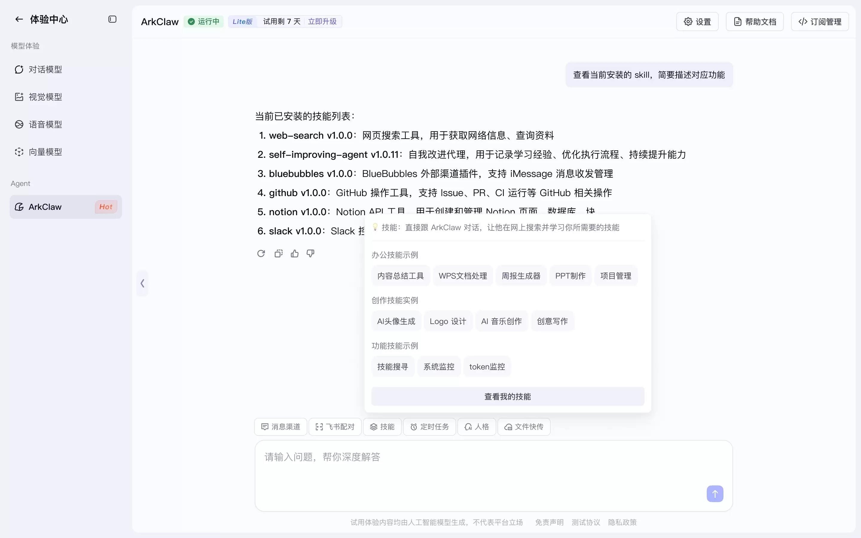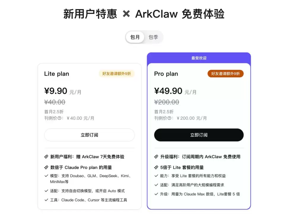 官方最新信息显示,“火山方舟Coding Plan”用户可以抢先体验ArkClaw,“Coding Plan Pro”用户登陆后即可同步使用,而“Coding Plan Lite”用户则能享受7天的免费试用。