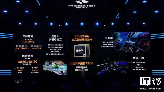 联发科技的C-X1座舱芯片发布于2024年10月,是一款采用3纳米工艺打造的天玑汽车座舱芯片。它最高可支持10块屏幕显示、16个摄像头,支持8K 30帧视频播放与录制、9K分辨率显示,并集成了5G与Wi-Fi 7等先进通信技术。